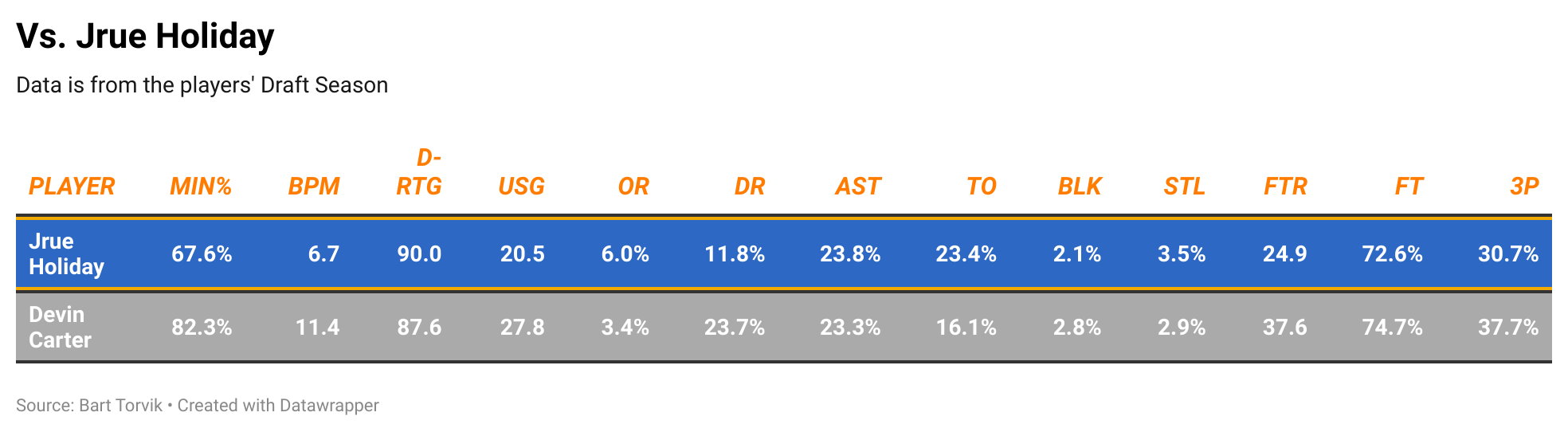 The ability to always make the right ‘basketball play’ is what separates Jrue Holiday from dozens of other NBA players that probably have a little bit more talent than he does, and Carter understands and sees the game in exactly the same way. In terms on their defensive impact, it’s hard to not see the similarities. Even though Carter is an inch shorter than Holiday, his wingspan and tenacity likely makeup for it over the course of an NBA career. If Carter has even 80% of the career Jrue Holiday has it’ll be a massive success, but knowing DC he’s aiming for higher than that.